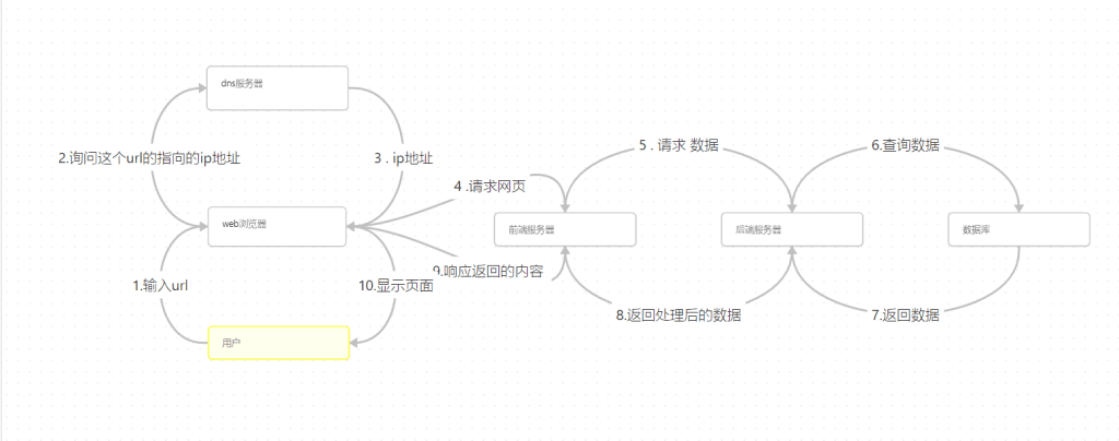 我们在浏览器中输入了url以后,计算机就会将url拿去进行dns解析,得到url对应的ip地址,得到目标ip地址后,我们向ip对应的web前端服务器发起请求询问是否可以建立TCP连接,连接建立之后向web前端服务器发起http请求,web前端服务器通过http请求的形式决定如何向web后端服务器请求数据,与web后端服务器建立连接,后端服务器向数据库查询数据并处理,返回数据给前端服务器,前端拿到数据渲染网页传回浏览器,直到你关闭网页tcp连接关闭(当然前端向后端发起请求也需要建立tcp连接)。